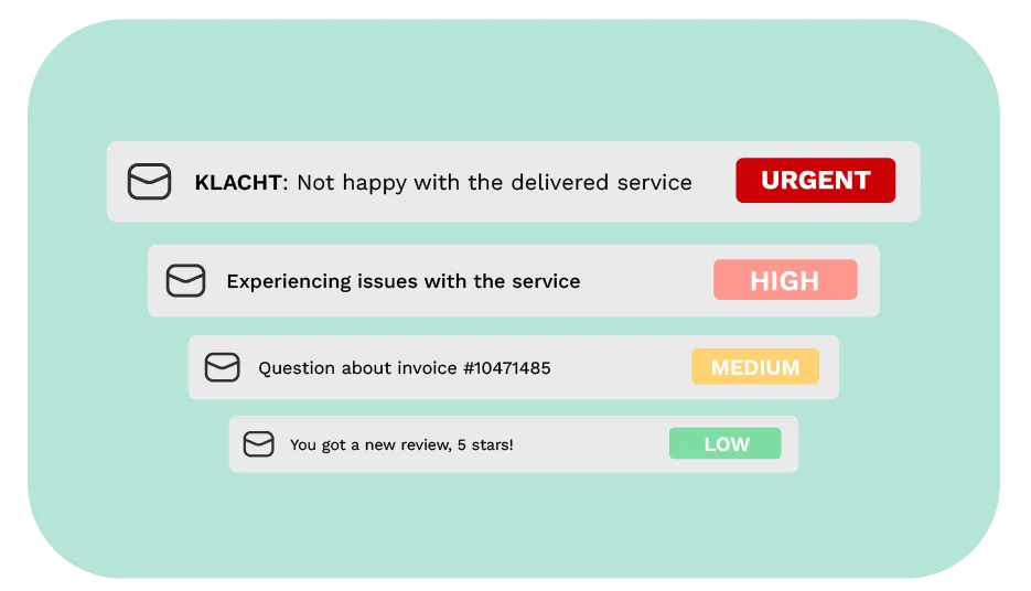 Onze slimme e-mailoplossing, aangedreven door AI, helpt je om je inbox efficiënt te beheren. Automatiseer categorisatie, opvolging en antwoorden op veelvoorkomende vragen. Bespaar tijd, houd overzicht en verbeter je communicatie – allemaal zonder extra inspanning.